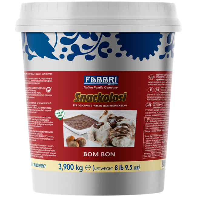 Bom Bon Snackolosi 4 kg — это восхитительный продукт от Fabbri, созданный для профессионального использования в кондитерском деле и производстве мороженого. Эта хрустящая смесь сочетает в себе насыщенный вкус фундука, покрытого нежным слоем молочного шоколада, с добавлением хрустящих вафельных кусочков, обеспечивая уникальную текстуру и богатый вкус, которые идеально дополняют мороженое, десерты и выпечку.