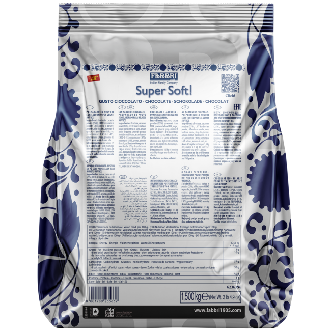 Fabbri Supersoft Chocolate Mix 1.5 kg — профессиональная основа для приготовления мягкого шоколадного мороженого с насыщенным вкусом и кремовой текстурой. Разработана для сегмента horeca, она легко растворяется в холодной воде и идеально подходит для использования в soft-ice машинах. Благодаря высокому содержанию какао (25%) и сбалансированной рецептуре, продукт обеспечивает стабильный результат, глубокий вкус и шелковистую консистенцию. Упаковка 1,5 кг оптимальна для заведений с высокой проходимостью и гарантирует высокую рентабельность.