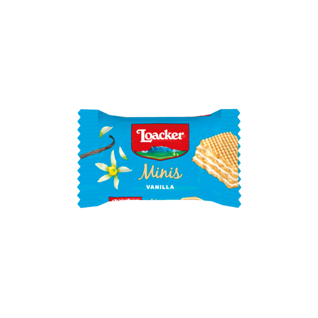 Loacker Minis Vanilla — это мини-вафли с четырьмя слоями хрустящих вафель и тремя слоями крема с натуральной ванилью Бурбон. Ваниль из Мадагаскара придаёт крему утончённый аромат и вкус. Формат 10 г — идеален для кофе-брейка или сладкого комплимента.